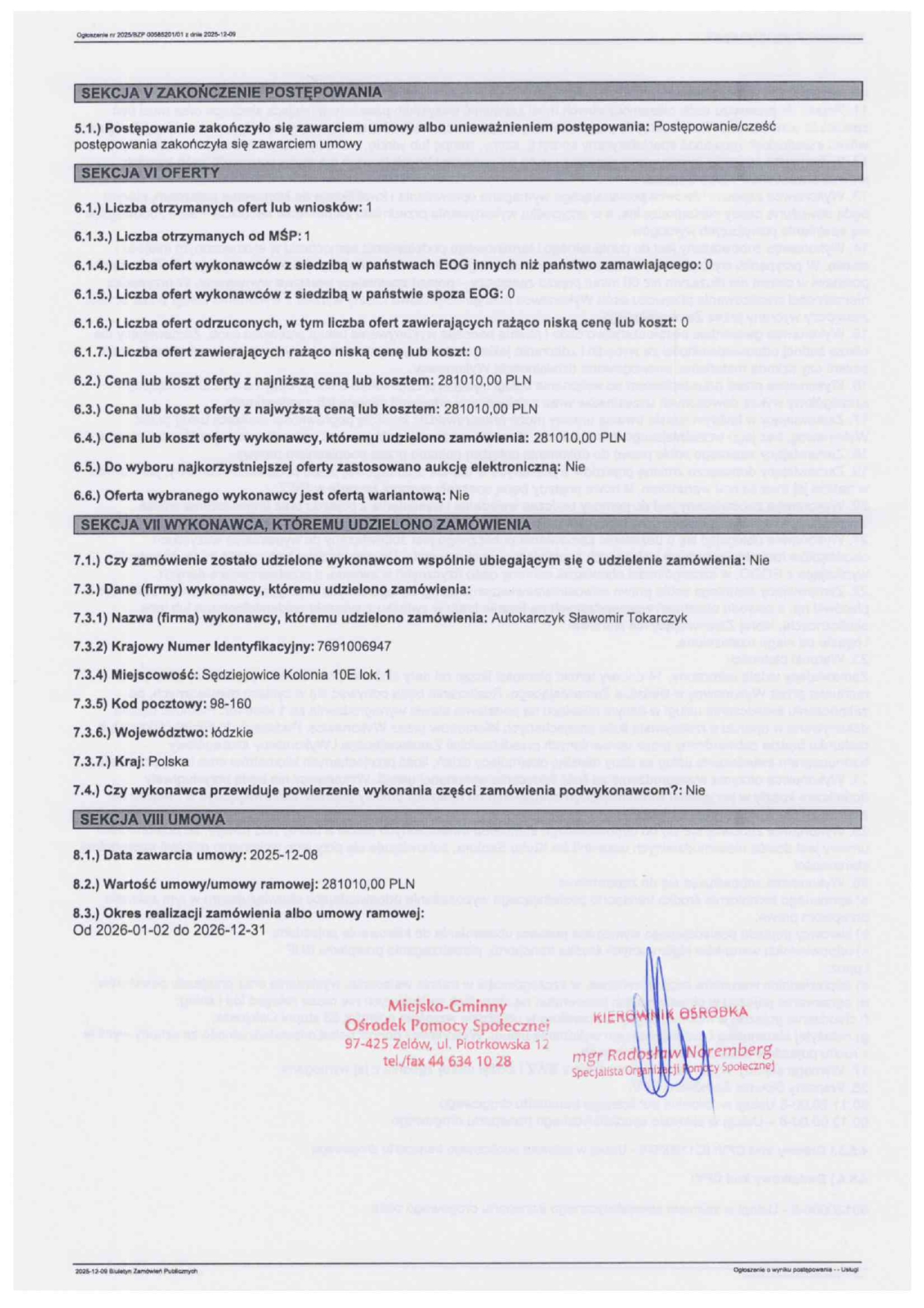 Ogłoszenie o wyniku postępowania