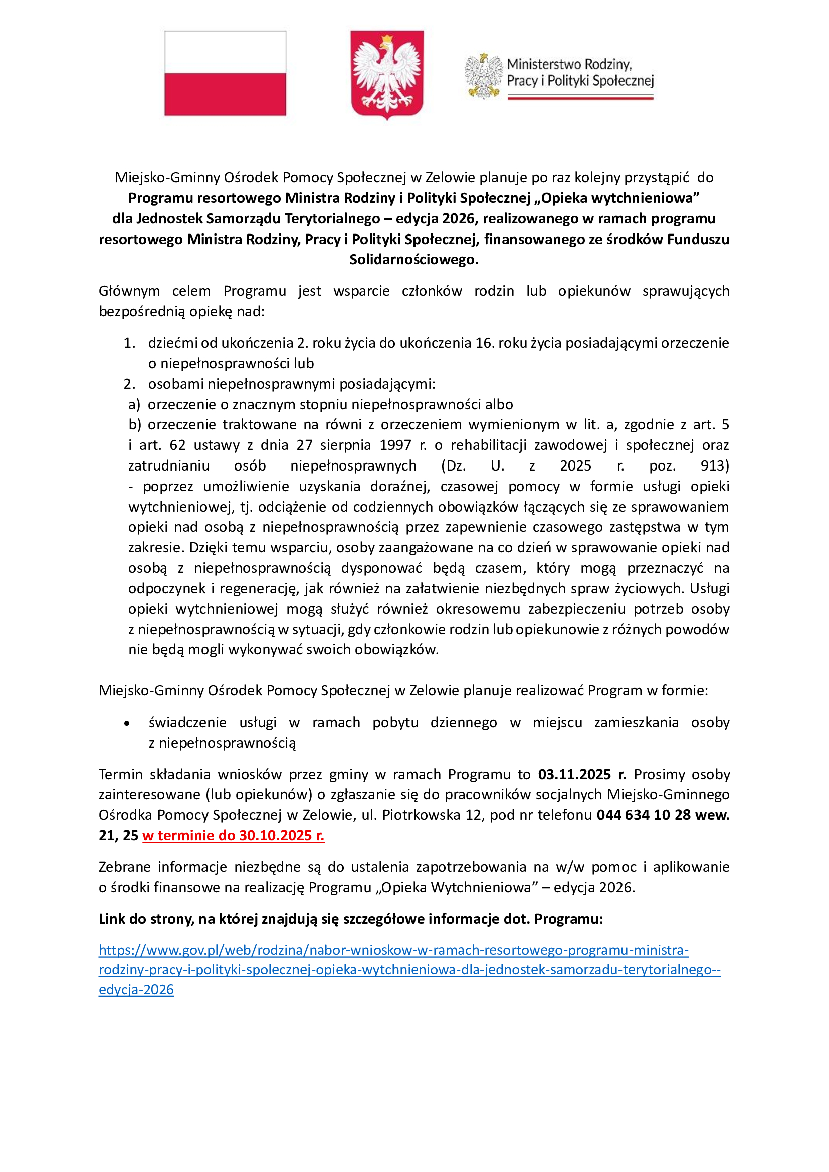 Wszelkie sprawy związane z przystąpieniem do Programu i jego realizacją można załatwić w siedzibie Miejsko-Gminnego Ośrodka Pomocy Społecznej w Zelowie, ul. Piotrkowska 12, 97-425 Zelów, w godzinach 7:30-15:30, wtorek 7:30-17:00. nr tel. 044/634-10-28 wew. 25, adres e-mail:
