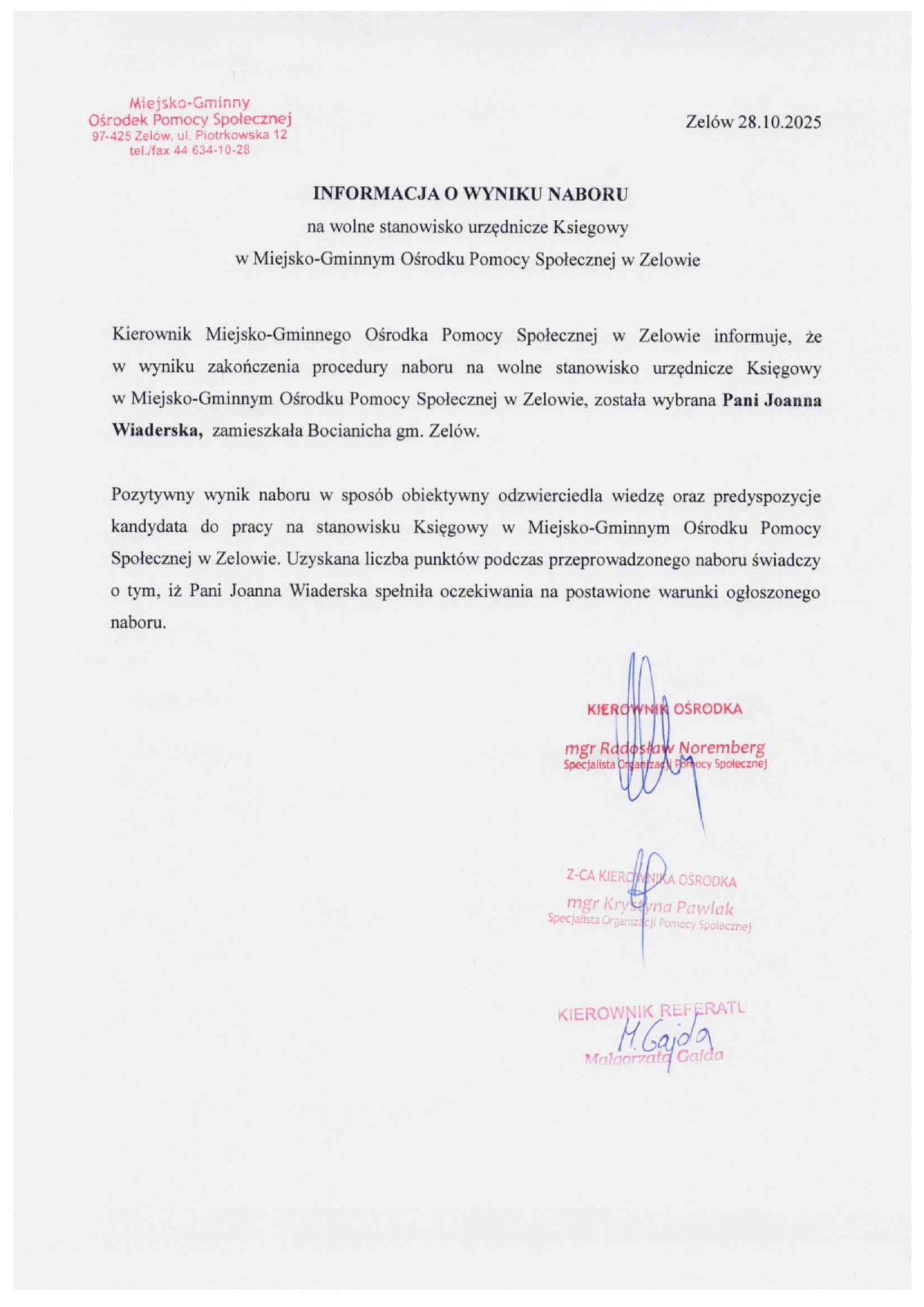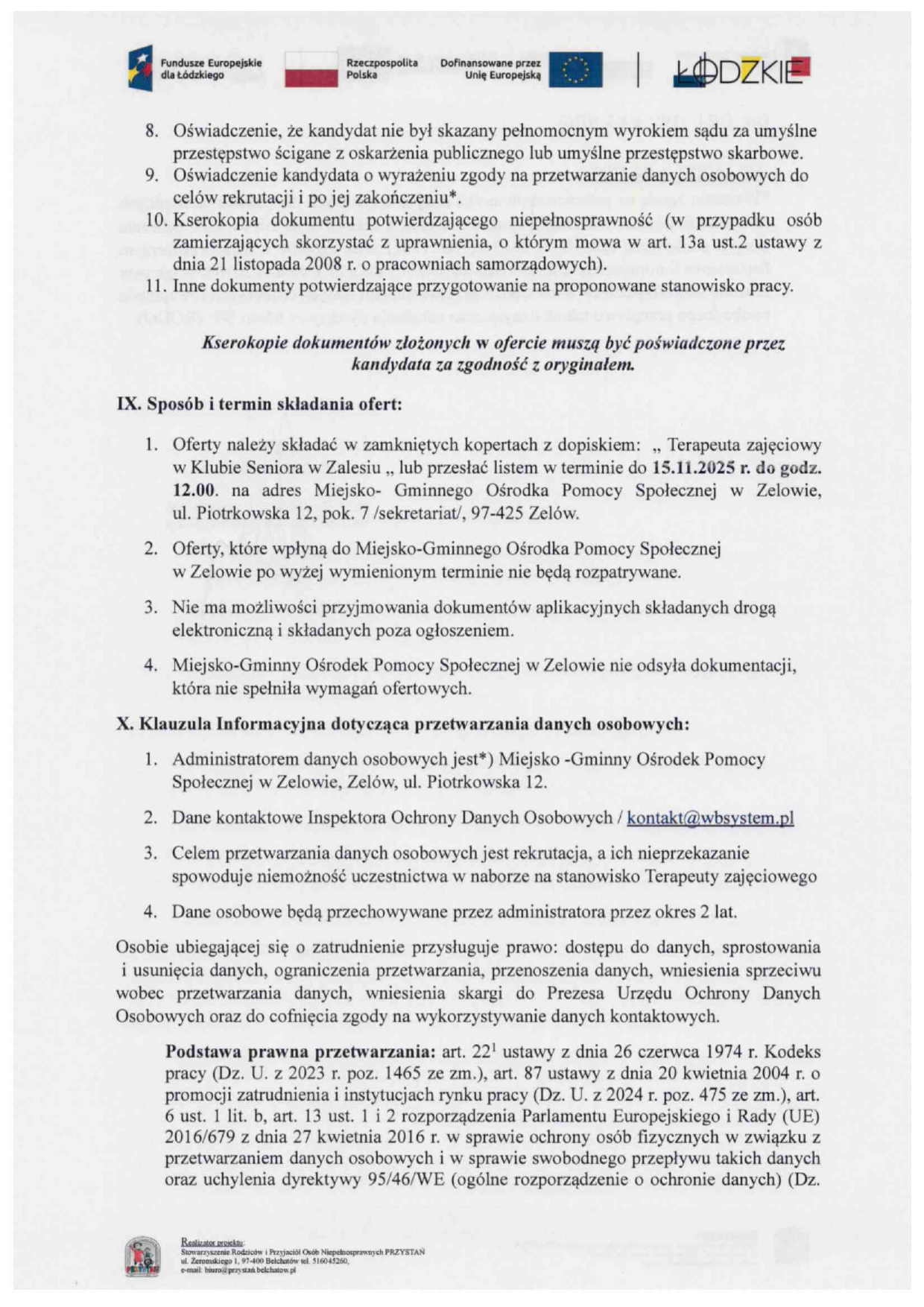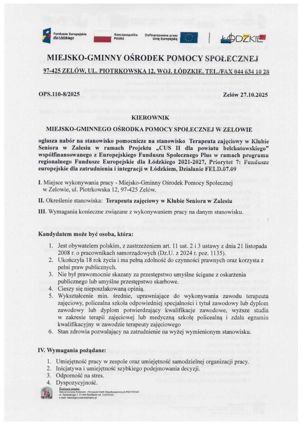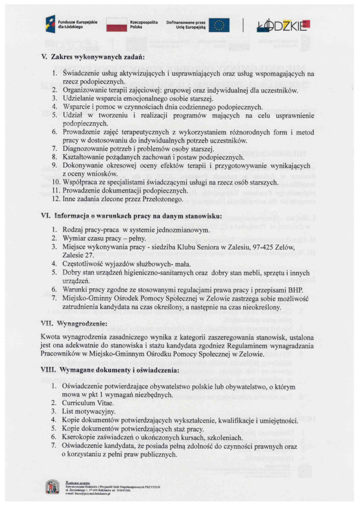 Nabór na stanowisko pomocnicze - Terapeuta zajęciowy w Klubie Seniora w Zalesiu